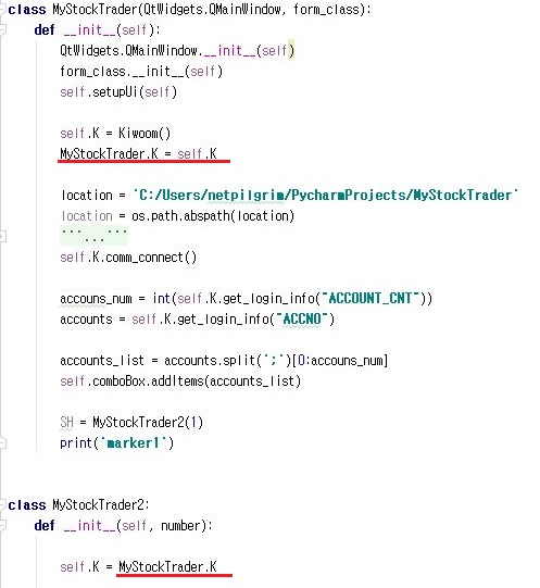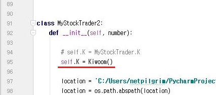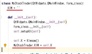 먼저 해야 할일은 이렇게 Kiwoom()을 두번이나 객체화 시켜서 생기는 문제라는 생각이 들었습니다. 그래서 한번 위 스크린샷처럼 K값을 다른 클래스에서 가지고 오도록 해 보겠습니다.