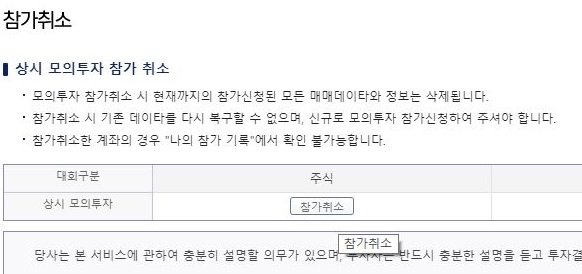 그리고 나서 다시 모의투자 참가를 하는 것으로, 뭐라고 해야 할까요? 일단 모의투자 계좌를 초기화 시키는 것을 했습니다.
