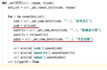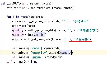 그래서 종목코드는 위 스크린샷처럼 str로 바꾸어 주도록 하고, 다음으로 주문상태로 만들어 이전처럼 시장가 같은 정보가 아니라 매수/매도 상태를 알아보도록 만들어 주도록 합니다.
