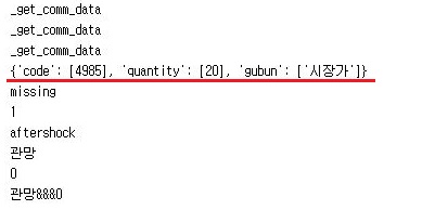 이제서야 매도라는 것으로 나오는 것을 확인할 수 있었습니다. 이렇게 해서 정보를 가지고 오는 것까지는 어떻게 성공적으로 나올 수 있었습니다만, 문제는 아직도 이 데이터를 가지고서 제 알고리즘 트레이딩이 처리를 하지 못하는 단계에 있다는 것 입니다.