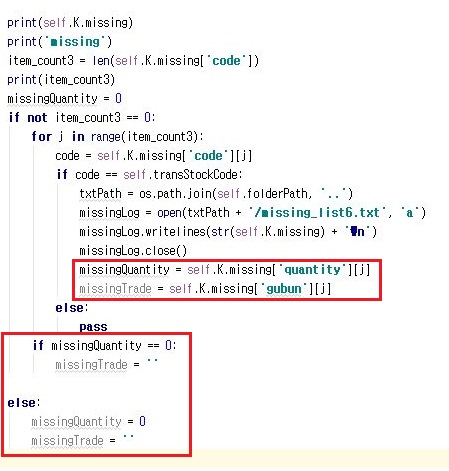 먼저 위 스크린샷처럼 for문의 dict에서 j회째 특정한 key의 값을 가지고 오도록 만들어 주도록 합니다. 그리고 나서, 이게 걸리지 않는다 = 해당 종목에 대해서 일단 미체결이 없으면 미체결 수량은 0, 그리고 매도/매수는 없음으로 만들어 줍니다.