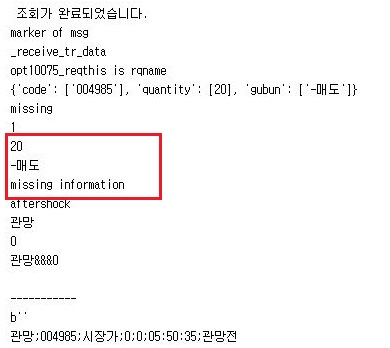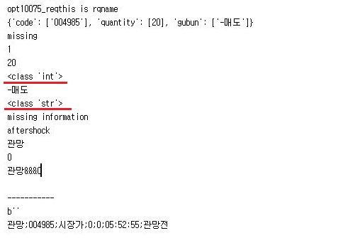 이렇게 해서 위 스크린샷에서 볼 수 있는 것처럼 일단 수량과 매도라는 것이 나오고 있는 것을 볼 수 있습니다. 그래서 일단은 자기 종목의 미체결 정보는 제대로 가지고 오는 것으로 결론이 났습니다.