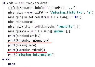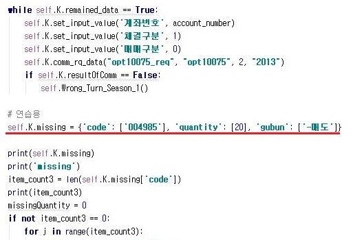 먼저 위 스크린샷처럼 for문의 dict에서 j회째 특정한 key의 값을 가지고 오도록 만들어 주도록 합니다. 그리고 나서, 이게 걸리지 않는다 = 해당 종목에 대해서 일단 미체결이 없으면 미체결 수량은 0, 그리고 매도/매수는 없음으로 만들어 줍니다.