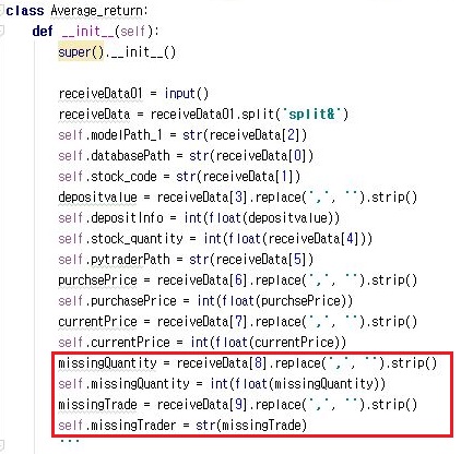 다음으로는 이 미체결에 관한 정보는 기존의 Average_Returing에 보내야 합니다. 이 부분에 두고서 많은 고심을 했지만, 결국 어찌어찌 해서 관련된 정보를 1개의 py파일에서 처리 하도록 했습니다.