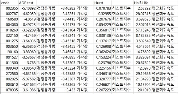이번 포스팅에서는 역시나 주말이 왔고, 그에 따라 어떤 종목들이 평균회귀를 보이는 것이 맞는지 아닌지 알아보기 위해서 한번 모든 코스피 종목에서 평균회귀를 위한 3종류의 테스트를 하고, 그 테스트를 모두 통과한 종목들을 골라서 한번 알아본 내용을 올리고자 합니다.