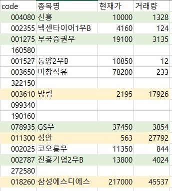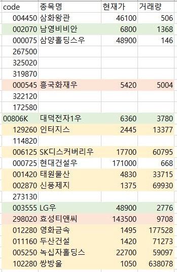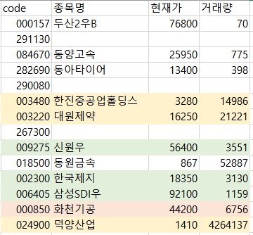일단 FirstClass에서 나온 내용입니다. 여기서 나온 내용을 가지고서 한번 이야기를 하고자 하면, 위 스크린샷에서 볼 수 있는 것처럼 먼저 노란색 배경은 1주당 1000원 이상이면서 동시에 1만 거래량 이상 나온 것을 가르킵니다. 그리고 초록색 배경은 거래량이 1000이상이기만 하면 유지가 되는 것으로 하는 것 입니다.