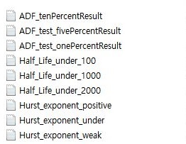 일단 평균회귀 테스트 3종을 돌린 결과, 위 스크린샷처럼 9개의 txt파일이 생성이 되는 것을 볼 수 있었습니다. 이렇게 하는 것으로 다음의 작업에 들어가 보도록 합니다.