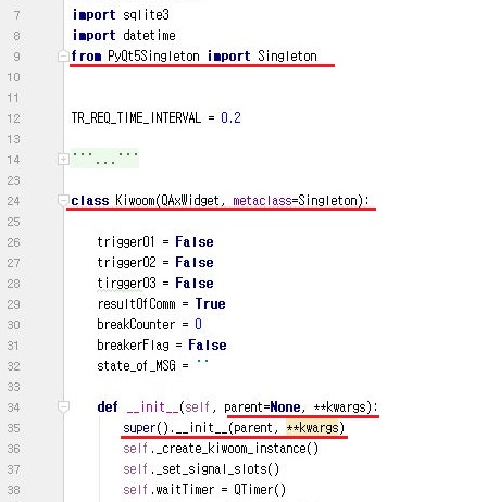 다음으로는 Kiwoom이라는 클래스를 위 스크린샷처럼 PyQt5Singleton을 이용해서 싱글톤으로 만드는 작업을 하도록 합니다.