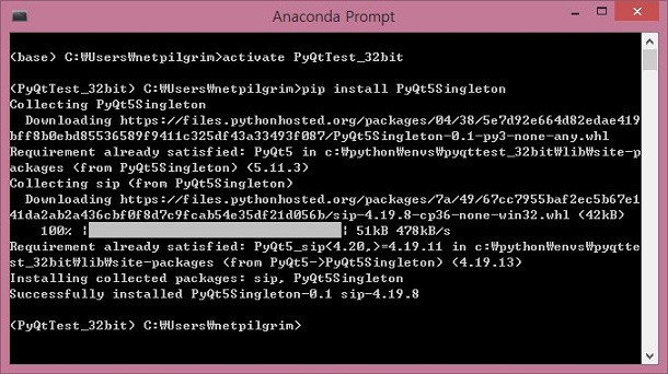 그래서 자료를 검색하다 보니, 위 스크린샷처럼 PyQt5Singleton이라는 것이 있다는 것을 확인할 수 있었습니다. 그래서 일단 이걸 pip를 이용해서 아나콘다 프롬프트에서 설치해 보도록 합니다.
