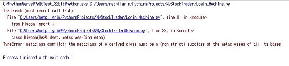 그래서 다음으로 생각한 것이 위 스크린샷처럼 싱글톤으로 만들기 위한 작업이었습니다. 왜 이런 작업을 하였냐 하면, 일단 Kiwoom이라는 클래스가 2번이나 불리니까 이게 서로 다른 Object이기 때문에 생기는 문제였습니다.