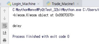 그래서 이게 어떻게 된 일인지 알아보기 위해서 self.K = Kiwoom()이라고 하고서 여기서 나오는 self.K를 일단 위 스크린샷에서 나오는 것처럼 print()함수를 사용해서 출력해 보도록 했습니다.