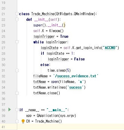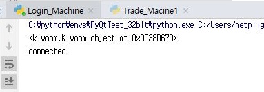 그 다음은 주식을 거래하기 위한 Trade_Machine을 만들어 주도록 합니다. 여기서 핵심은 이 py파일에는 로그인을 하라는 명령이 없습니다.