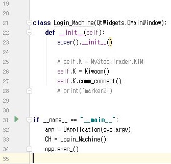 그리고 나서 위 스크린샷처럼 코딩을 하였는데, 일단 키움증권의 OpenAPI와 접촉하는 모든 것을 다 가지고 오도록 코딩을 하기는 하였습니다. 그리고 나서 해야 할 일은, 일단 app.exec_()를 두어서 계속해서 로그인이 된 다음에 종료가 되지 않도록 하는 것 입니다.