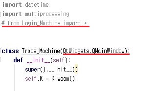 그 다음은 주식을 거래하기 위한 Trade_Machine을 만들어 주도록 합니다. 여기서 핵심은 이 py파일에는 로그인을 하라는 명령이 없습니다.