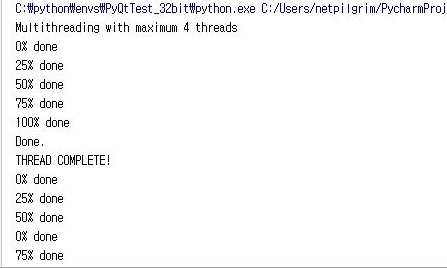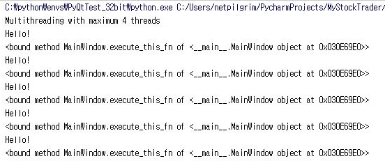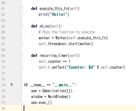 일단 실행을 시켜보면, 위 스크린샷처럼 나오는데, 아마도 Worker()의 ()안에 들어간 메서드에서 나오는 메세지를 받은 다음에, 이걸 QThread에서 따로 넘겨줄 수 있는 것으로 보입니다.