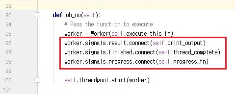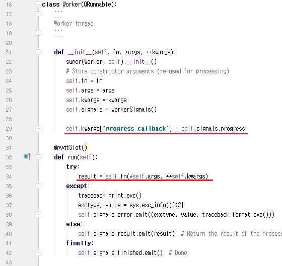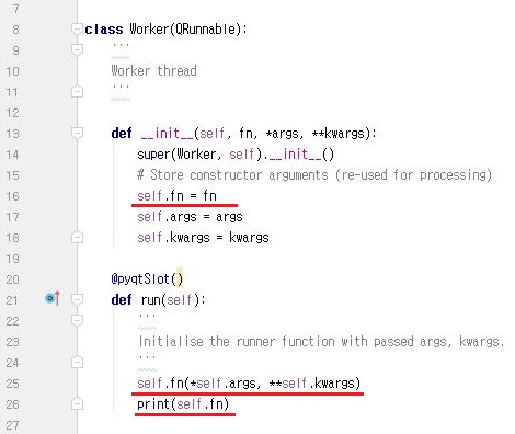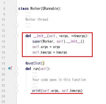 그리고 나서 다음으로 해야 할일은 위 스크린샷에서 볼 수 있는 것처럼 __init__를 이용해서 일종의 데이터를 받아와서 QRunnable을 생성하는 작업에 대해서 일단 다루어 볼까 합니다.