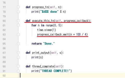 그리고 나서 Qrunnable에서는 위 스크린샷과 같은 내용을 집어 넣어 보도록 합니다. 왜 니렇게 하느냐 하면 이후에 이를 전체 프로세스의 진행을 나타내주는 척도로 사용할 수 있기 때문입니다.