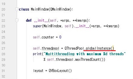 그래서 한번 정보를 구글에서 검색해 보니까, 위 스크린샷처럼 일단 먼저 해야 할일은 QThreadPool뒤에다가 globalInstance()라는 명령어를 하나 더 붙이는 일인데, 이건 제가 테스트 해 보지는 않았지만, 일단 붙여 주는 것으로 했습니다.