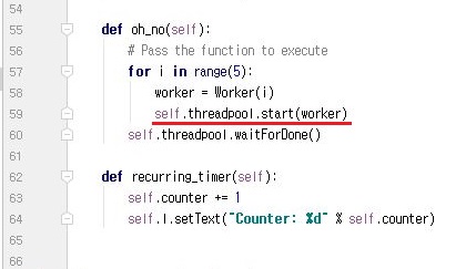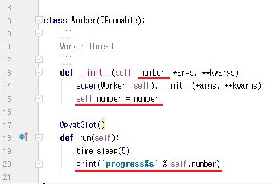 그리고 나서 위 스크린샷에서 나오는 것처럼 일단 처음에는 각각의 스레드마다 데이터를 GUI스레드 = 메인 스레드에서 받을 수 있는지를 한번 처리해 보고자 합니다. 먼저 __init__에 number라는 새로운 변수를 주도록 합니다.