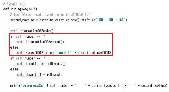 다음으로 해야 할일은 위 스크린샷처럼 계좌의 기본정보를 가지고 오는 내용이 있는데, 이 메서드 역시 첫번째로 실행이 되는 스레드가 아니면 실행을 하지 말고, 그냥 첫번째 스레드가 가져온 정보를 공유하도록 합니다. 이제 이게 제대로 작동이 되는 것을 확인할 수 있었습니다. 다만, 앞으로 남은 코드는 아직도 많이 남아 있습니다.