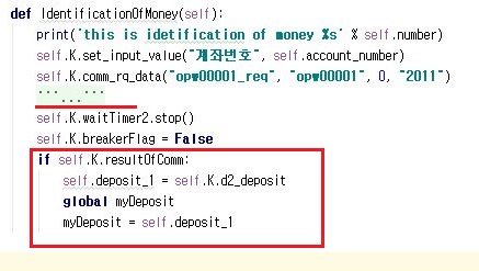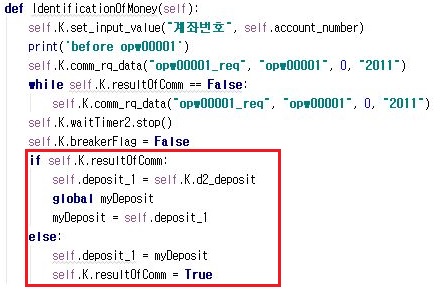 그리고 나서 위 스크린샷처럼 예수금을 확인하면, 예수금 정보를 위 스크린샷처럼 일단 광역변수인 global로 만들어 놓은 변수에 집어 넣도록 합니다.