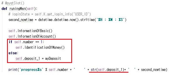 아예 이번에는 메서드를 작성하기를, 모든 스레드가 모두 정보를 각각 요청할 필요 없이, 일부 정보는 공유를 해도 별 문제가 없을 것으로 생각을 합니다. 그래서 1번 스레드, 처음으로 실행이 되는 스레드의 경우에만 예수금을 요청하고, 요청해서 받아온 정보를 광역변수에 저장합니다. 그리고 나머지 스레드는 이 광역변수에서 정보를 받아서 공유하도록 합니다.