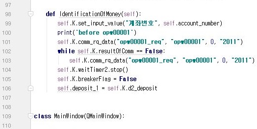 이번 포스팅에서는 예수금을 알아오기 위한 메서드를 작성해서 한번 적용해 보도록 하겠습니다. 이 작업도 쉽게 끝날 것이라고 처음에는 생각을 했습니다만, 점점 작업이 하나하나 만만하지 않다는 것을 알 수 있었습니다. 처음에는 그저 스파케티 코드를 피하자고 했는데, 이것도 만만하지 않았습니다.