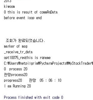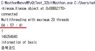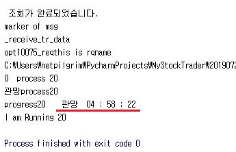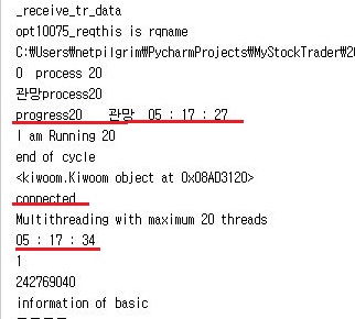 일단 마지막 20번째 스레드가 마친 시간을 표시하고 있습니다. 이 시간을 봐서는 계산해 보면 41초라는 것을 알 수 있었습니다. 이게 실전 모의투자에 들어가면 얼마나 걸릴 지는 모르겠습니다만, 일단 여기까지 할 수 있기는 있었습니다.