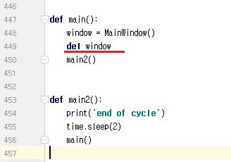 그래서 del명령어를 써서 기존에 있던 클래스의 인스턴스를 제거하는 과정에 들어가 보도록 했습니다. 그리고 나서 과도한 사이클을 돌수 있는 것을 방지하고자 일단 2초 정도 쉬어 가도록 만들어 주었습니다.