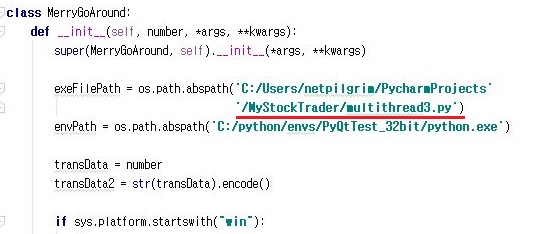 다음으로 해야 할일은 위 스크린샷처럼 기존의 multithread3.py의 부모 프로세스를 만들어 주는 것 입니다. 이 py파일에서는 위 스크린샷처럼 회전목마라는 이름의 클래스를 만들어 주고, 자식 프로세스를 목적으로 했는 multithread3.py로 지정해 주도록 합니다.