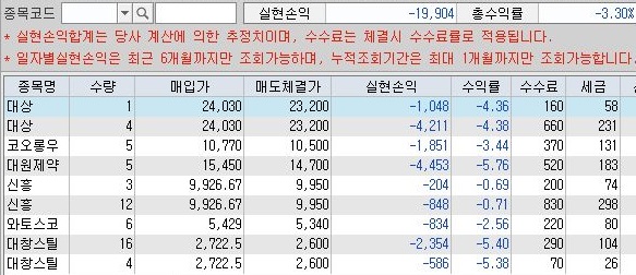 이게 바로 미수금이 발생해서 나오는 현상이라고 해서 강제매도인데, 문제는 이로 인한 손실이 이제까지의 이익을 덮어버릴 만큼 상당히 크다는 것을 알 수 있었습니다.