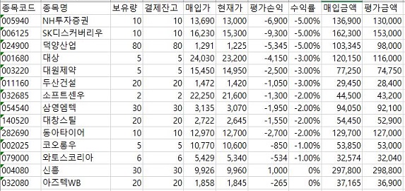 그리고 나서 매수를 하고 나서 계속해서 가격이 내려간 종목들이 있는 것을 발견할 수 있었습니다. 이런 종목들을 왜 매수하게 되었는지와 공통점이 있는지를 일단 조사할 필요는 있다는 생각이 들었습니다.