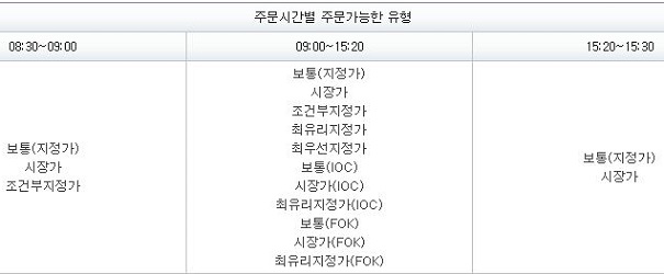 문제는 이런 주문을 낼 수 있는 시간이 장중에서도 마감 10분 전까지만 가능하다는 것을 생각하면, 일단 나중에 만들어야 하는 프로그램에는 현재 시간을 고려해서 이 주문을 낼 수 있도록 만들어야 겠다는 생각이 듭니다.