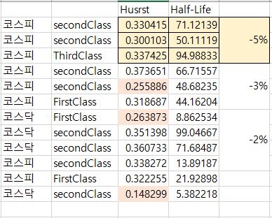 여기서 한가지 공통점을 발견할 수 있었습니다. 단 3번의 경우를 제외하고는 대다수의 경우가 허스트 지수가 0.3 이상인 경우에 이런 일이 발생한다는 것을 알 수 있었습니다. 그래서 다음번에 종목을 선정할 때는 허스트 지수를 잘 봐야 겠다는 생각이 듭니다.