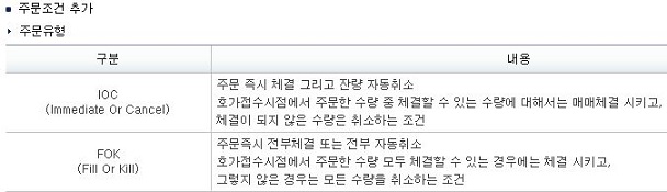 먼저 한번 알아본 결과를 정리하는 시간을 가지겠습니다. 일단 IOC와 FOK라는 거래조건이 또 있는데, 이 조건들이 바로 제가 찾는 거래조건이 아닌가 합니다. 특히 IOC의 경우에는 매도 주문을 냈는 즉시 체결이 되지 않거나 미체결이 된 수량이 있으면, 그 수량에 대해서 바로 취소할 수 있기 때문에 상당히 유용해 보입니다.