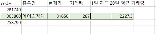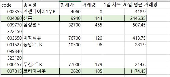 그래서 이번에는 영웅문4에서 20일간의 평균 거래량을 한번 찾아보는 것으로 해서, 위 스크린샷처럼 겨우 2개의 종목을 더 추가할 수 있었습니다.