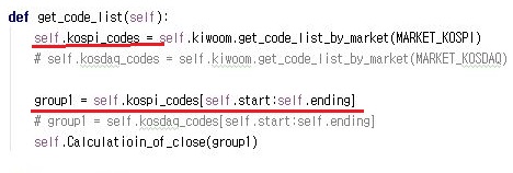 그리고 나서 처음으로 하는 것은 먼저 코스피를 중심으로 해서 어떻게 찾아보는 것으로 하기 위해서 위 스크린샷처럼 코드를 만들어 주도록 합니다.