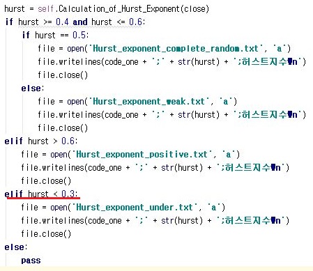 그리고 나서 그전에는 허스트 지수가 0.4 미만인 경우만 포함을 시켰는데, 지난번에 매수를 하고 나서도 계속해서 하락을 하는 종목이 나왔는 것으로 봐서, 아예 0.3 미만으로 바꾸었습니다.
