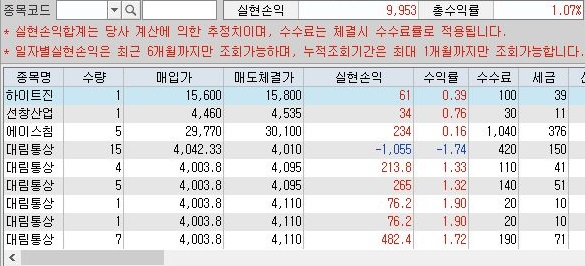 결국 이런 식으로 3번의 손해를 보는 거래가 있었고, 이 거래때문에 라고 해야 할까요? 그래도 9900원을 넘는 상당한 수익이기는 하지만, 이 수익이 하루 1만원을 넘을 수 있었는데 아쉽습니다.