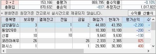 그리고 가장 큰 관심사항 중에 하나였던 레버리지 투자가 끝내 일어나지 않았습니다. 결국 어떻게 해서 위 스크린샷처럼 -로 d+2추정예수금이 되니까 더 이상의 매수가 일어나지 않았고, 다시 +로 회복이 될 때까지 기다리는 것을 볼 수 있었습니다.