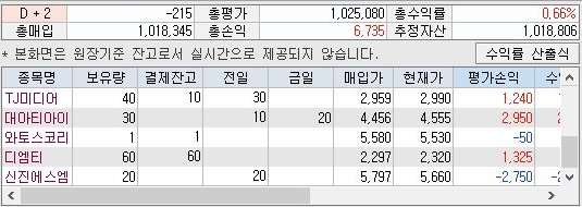 그리고 가장 큰 관심사항 중에 하나였던 레버리지 투자가 끝내 일어나지 않았습니다. 결국 어떻게 해서 위 스크린샷처럼 -로 d+2추정예수금이 되니까 더 이상의 매수가 일어나지 않았고, 다시 +로 회복이 될 때까지 기다리는 것을 볼 수 있었습니다.