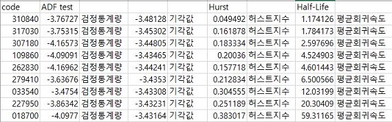 코스닥의 결과 역시 코스피와 마찬가지로 일단 위 스크린샷에서 볼 수 있는 것처럼 먼저 Half-Life를 기준으로 해서 오름차순 정렬하고 다음으로 허스트 지수를 기준으로 2차 정렬해 줍니다.
