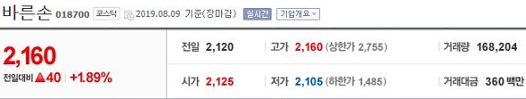 바른손의 경우에는 1주당 가격이 조금 떨어지기는 하지만, 거래량을 생각하면 절대로 거래가 없는 종목이 아닌데 이렇게 나오는 것은 무엇때문인지 모르겠다는 생각이 듭니다.