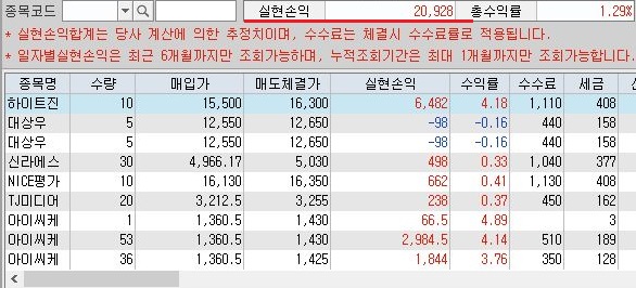 그렇게 해서 종합적인 실현손익이 얼마가 되느냐 했더니, 위 스크린샷에서 알 수 있듯이 2만 928원이라는 수익을 거둔 것을 확인할 수 있었습니다!