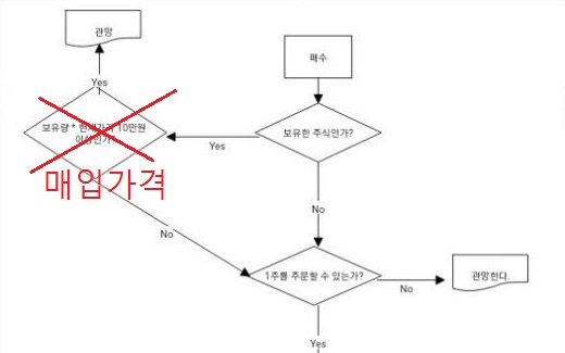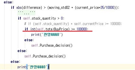 이제 매수 알고리즘을 개선할 차례입니다. 기존에는 여기서 현재가 X 보유량을 계산해서 10만원을 넘는지 아닌지 측정해서 매수를 하느냐 마느냐 했는데, 이 부분을 매입가격으로 바꾸도록 합니다.