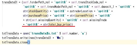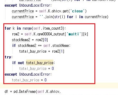 다음으로 해야 할일인 dataprocessing이라는 메서드에서 두뇌역할을 하는 py파일로 보내기 위한 내용물을 만들어 내는 과정에 들어가려 합니다. 일단 여기서는 for문을 통해 전부 돌려 보는데, 여기서 종목명이 일치하면 매입금액 정보를 가지고 오도록 합니다.