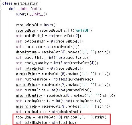 이제 매수 알고리즘을 개선할 차례입니다. 기존에는 여기서 현재가 X 보유량을 계산해서 10만원을 넘는지 아닌지 측정해서 매수를 하느냐 마느냐 했는데, 이 부분을 매입가격으로 바꾸도록 합니다.