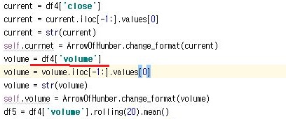 이제 여기서 중요한데, 기존의 InformationHunter에서 왜 에러가 발생했느냐 했더니, 그동안 까먹은 게 하나 있었습니다. 우선 키움증권 서버에서 ohlcv 를 가지고 오면 순서가 최신이 가장 위에 오는 식으로 나온다는 것 입니다. 그래서 일단 사각 박스안에 있는 내용으로 순서를 바꾸도록 하고, 다음으로 df4[칼럼명']으로 해서 원하는 칼럼만 가지고 오도록 합니다. 그러나 이건 아직 pandas의 dataframe형태이기 때문에, iloc[-1:].values[0] 이라는 값을 넣어서 원하는 데어터만 골라 주도록 하고, 이어 나오는 값을 str()형식으로 만들어 주도록 합니다.