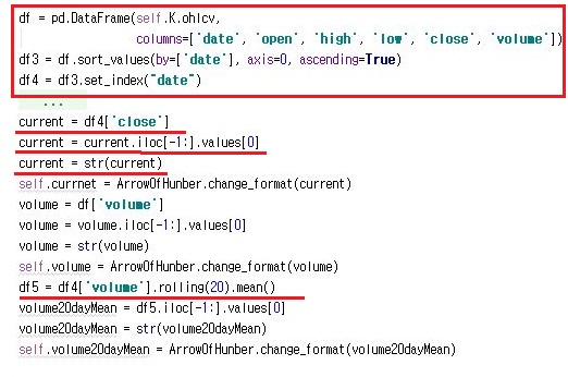 이제 여기서 중요한데, 기존의 InformationHunter에서 왜 에러가 발생했느냐 했더니, 그동안 까먹은 게 하나 있었습니다. 우선 키움증권 서버에서 ohlcv 를 가지고 오면 순서가 최신이 가장 위에 오는 식으로 나온다는 것 입니다. 그래서 일단 사각 박스안에 있는 내용으로 순서를 바꾸도록 하고, 다음으로 df4[칼럼명']으로 해서 원하는 칼럼만 가지고 오도록 합니다. 그러나 이건 아직 pandas의 dataframe형태이기 때문에, iloc[-1:].values[0] 이라는 값을 넣어서 원하는 데어터만 골라 주도록 하고, 이어 나오는 값을 str()형식으로 만들어 주도록 합니다.