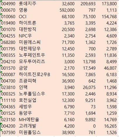 이렇게 해서 위 스크린샷과 같이 펀드와 같은 종목들을 모두 제외를 시키고 나서, 다양한 종목들을 가지고 오는데 성공했습니다.